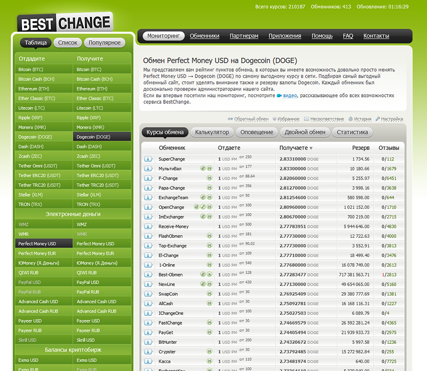Окей, кошельки мы завели, так как же купить заветные монетки? Всё очень просто, я делаю это, используя обменники. Заходим на мониторинг обменников BestChange Слева выбираем откуда меняем и на что (на примере ниже я выставил Perfect Money на DogeCoin), справа появится список обменников, которые в данный момент готовы выполнить эту операцию, минимальная сумма обмена, курс, резерв и отзывы (обращайте внимание,чтобы положительных отзывов было не 50-100, а побольше, обменников много, и лучше использовать максимально надёжные и проверенные). Нажимаем на название устроившего вас обменного пункта, попадаем на его сайт, а далее, следуя инструкциям, производим обмен. Кто ни разу не сталкивался с этим, может подумать, что всё сложно и муторно, на деле же всё очень просто и быстро, стоит пару раз попробовать. Продавать криптоактивы можно аналогичным способом, совершая обмен на электронные кошельки или банковские карты